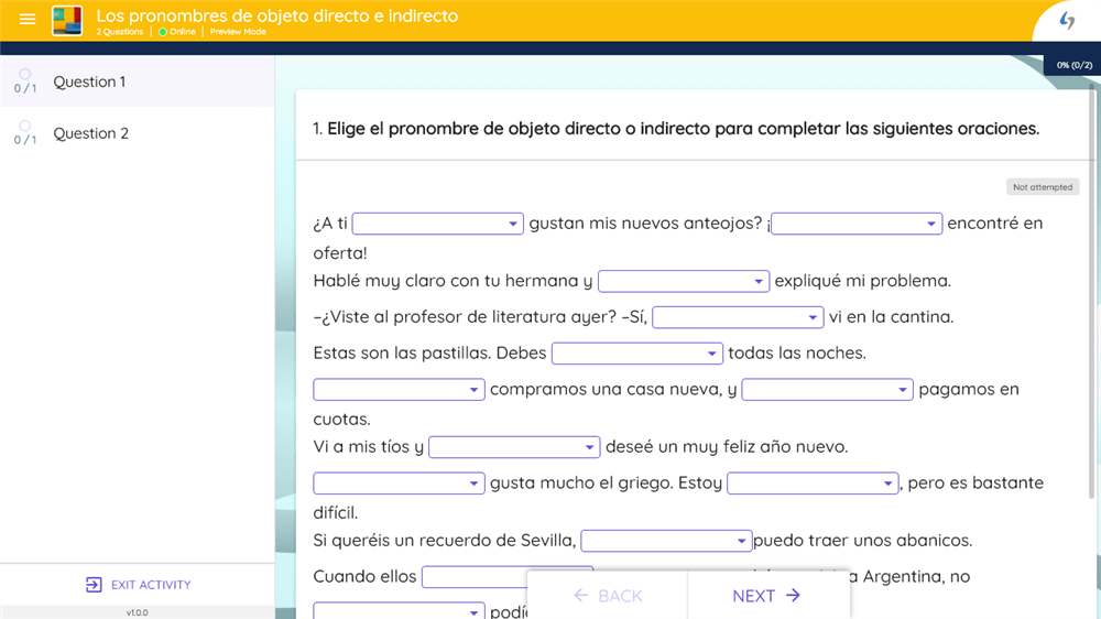 Esta hoja de trabajo muy interesante te ayudará a practicar los pronombres de objeto directo en español con dos ejercicios muy interesantes.